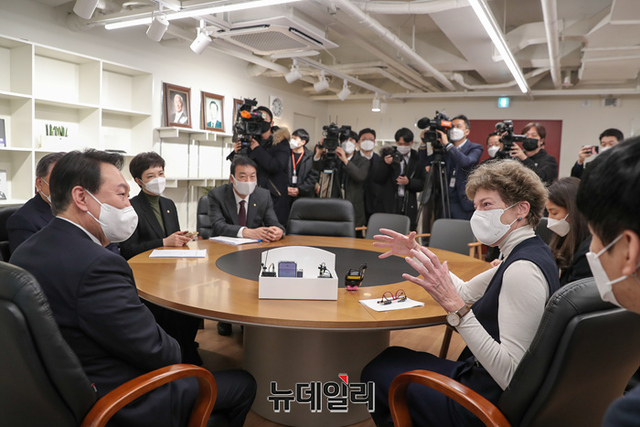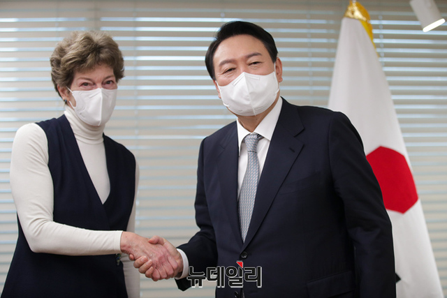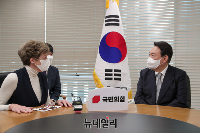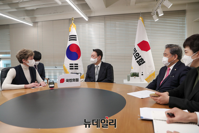 윤석열 국민의힘 대선후보가 9일 오전 서울 여의도 국민의힘 당사에서 캐슬린 스티븐스 전 주한미국대사를 접견하고 있다. (사진=윤석열 캠프)