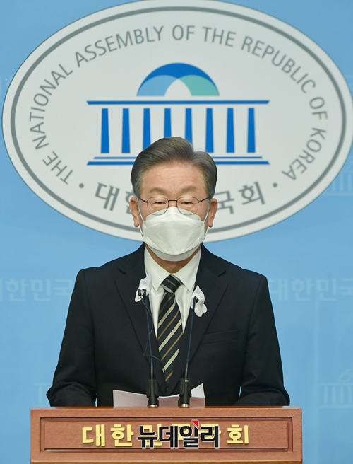 이재명 더불어민주당 대선 후보가 9일 국회 소통관에서 감염병대응정책관련 긴급 기자회견을 하고 있다.
