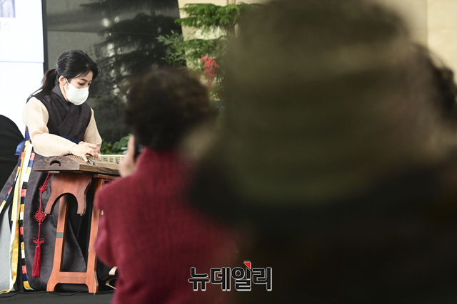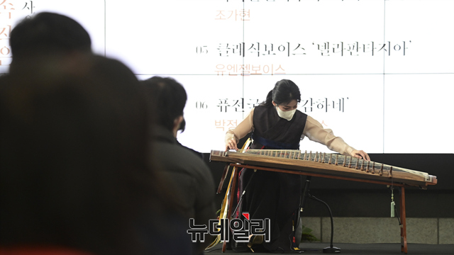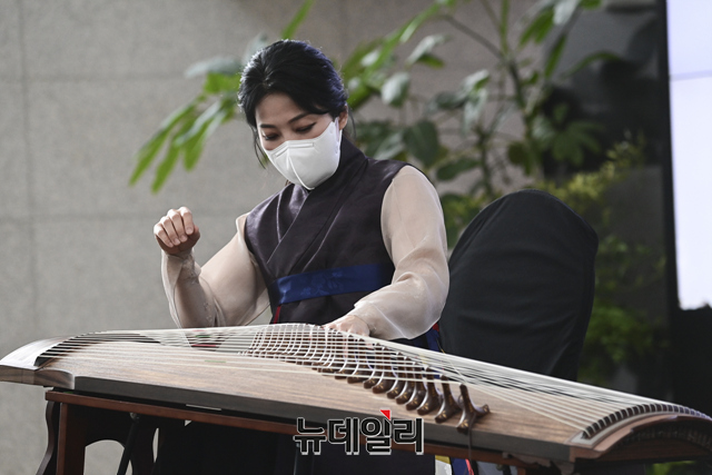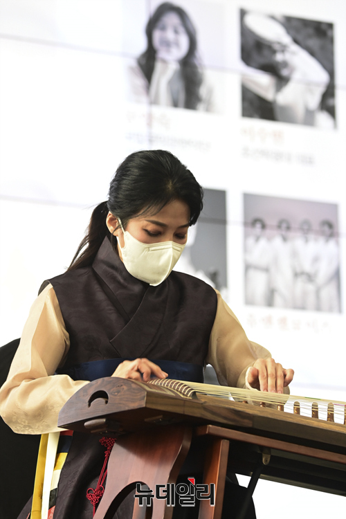 문양숙 국립국악관현악단이 9일 오전 서울 용산구 국립중앙박물관 으뜸홀에서 열린 '사유의 방' 개관 기념 '박물관 속 작은 음악회-사유동락'에서 가야금 창작음악 침묵의 소리 공연을 선보이고 있다.국립중앙박물관 관계자는 "특별공연은 국보 반가사유상이 갖고 있는 내재적 가치와 그 상징성을 고려해 전통 음악과 춤을 다채롭게 구성을 준비했다"고 말했다.이어 "국보 반가사유상에 어울리는 음악과 춤으로 극도의 고졸미를 느낄 수 있는 유일무이한 공연이다"며 "전 세계 국립박물관 어디에서도 보기 드문 전시유물을 주제로 삼았다"고 말했다.