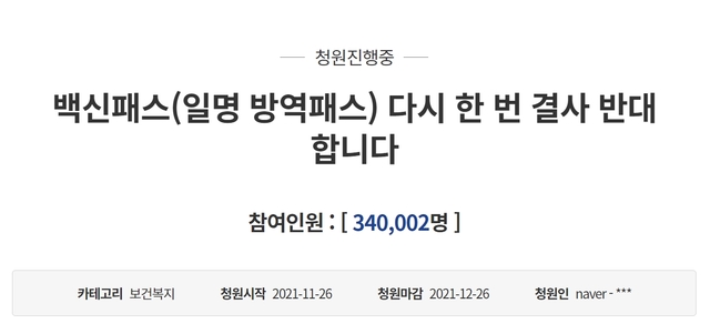 "방역패스 강행 예고한 문 대통령과 정은경 질병청장 고발할 것"청와대 국민청원 게시판에도 '방역패스' 반대 청원 줄이어