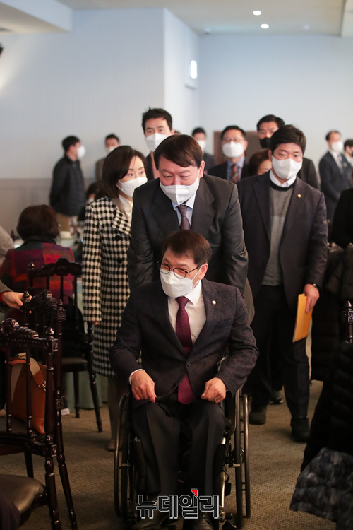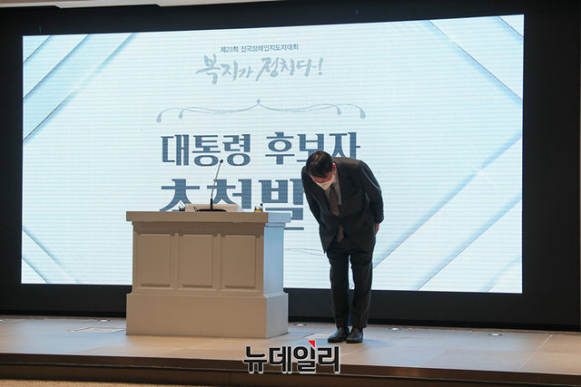 윤석열 국민의힘 대선후보가 10일 오전 서울 여의도 CCMM빌딩에서 열린 전국장애인 지도자대회에 참석해 안철수 대표와 대화를 나누고 있다. (사진=윤석열 캠프)