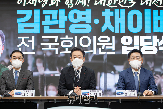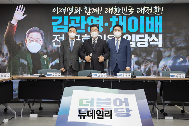 이재명 더불어민주당 대선후보가 9일 오전 서울 영등포구 더불어민주당사에서 열린 바른미래당 출신 김관영, 채이배 전 의원의 입당식에서 기념사진을 촬영하고 있다. (사진=이재명 캠프)