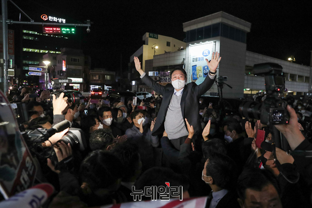 윤석열 국민의힘 대선후보가 10일 오후 강원 강릉중앙시장을 방문해 시민들에게 두손을 들어 인사를 하고 있다. (사진=윤석열 캠프)