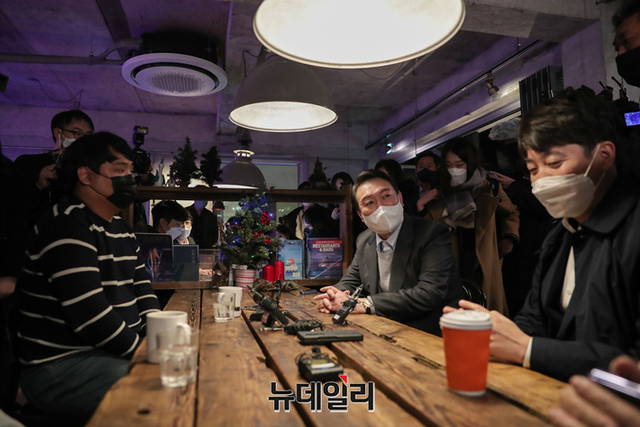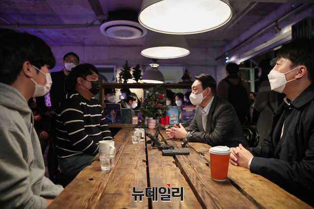 윤석열 국민의힘 대선후보가 10일 오후 강원 강릉시의 한 카페에서 흉기난동범을 맨손으로 제압한 전중현, 변정우 씨를 만나 대화를 나누고 있다. (사진=윤석열 캠프)