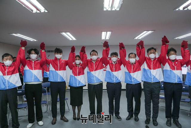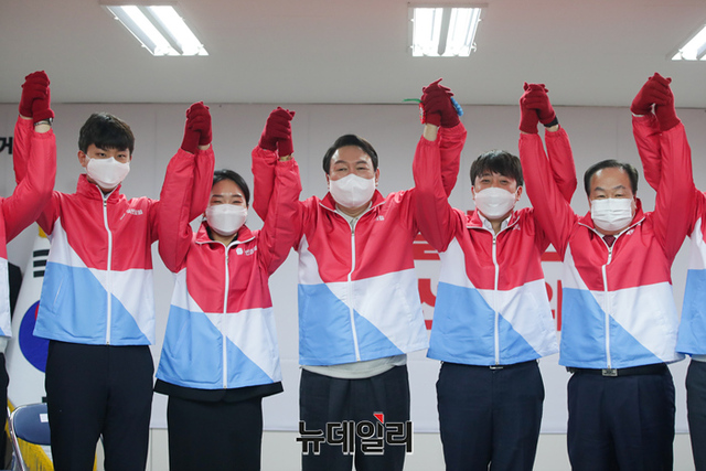 강원지역을 방문중인 윤석열 국민의힘 대선후보가 11일 오후 강원 춘천시 국민의힘 강원도당에서 열린 선거대책위원회 출범식에 참석해 참석자들과 손을 맞잡고 승리를 다짐하고 있다. (사진=윤석열 캠프)