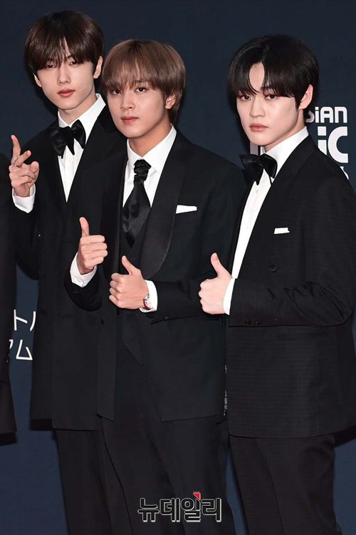 엔시티 드림(마크, 런쥔, 제노, 해찬, 재민, 천러, 지성)이 11일 오후 경기 파주시 CJ ENM 스튜디오 센터에서 열린 '2021 엠넷 아시안 뮤직 어워즈(2021 MAMA)' 레드카펫에서 포즈를 취하고 있다.