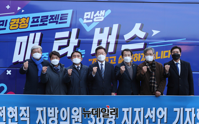 이재명 더불어민주당 대선 후보가 11일 오후 경북 안동시 MBC안동문화방송 앞에서 열린 경북 무소속 전현직 지방의원 38명 지지선언 기자회견에서 기념촬영을 하고 있다. (사진=이재명 캠프)