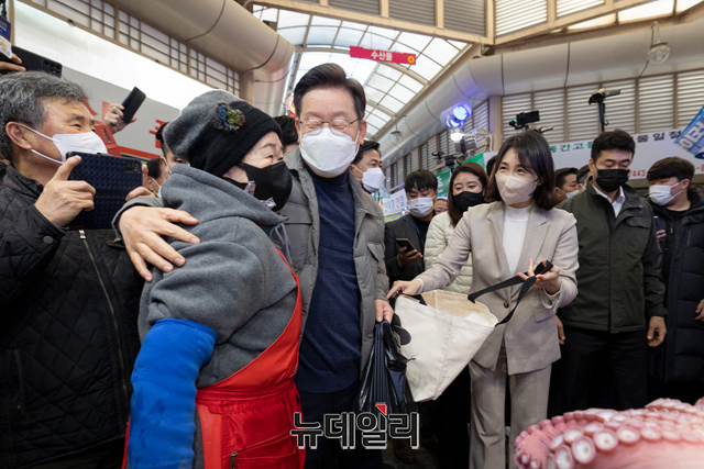이재명 더불어민주당 대선 후보와 부인 김혜경 씨가 11일 오후 경북 안동 중앙신시장을 방문해 시민과 기념촬영을 하고 있다. (사진=이재명 캠프)