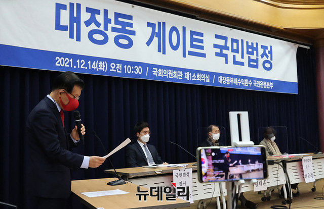 대장동부패수익환수국민운동본부가 14일 오전 국회 의원회관에서 대장동 게이트 국민법정을 열고 모의재판을 하고 있다.