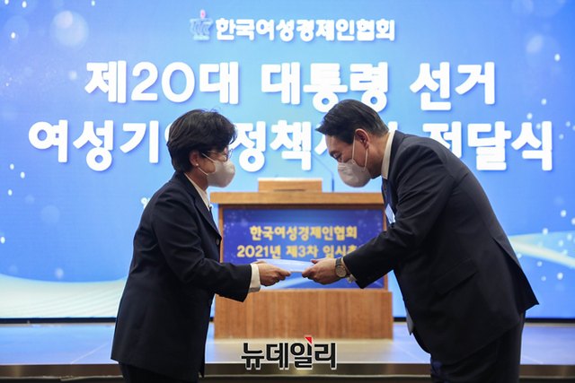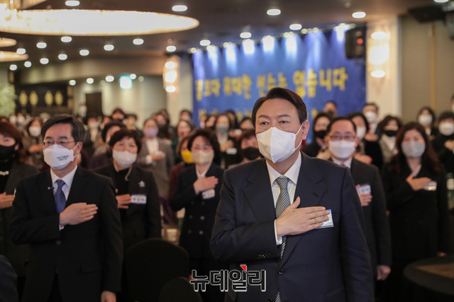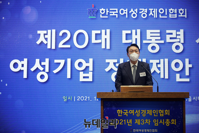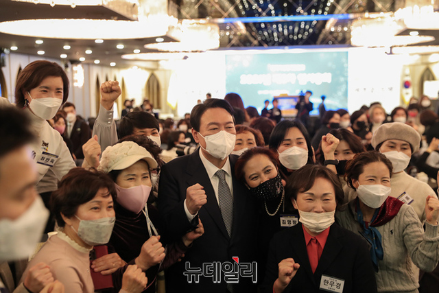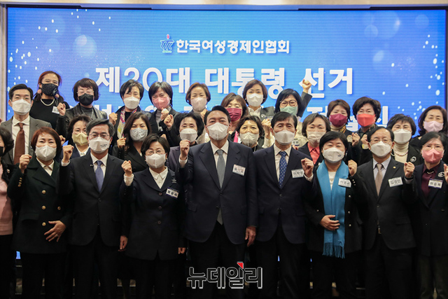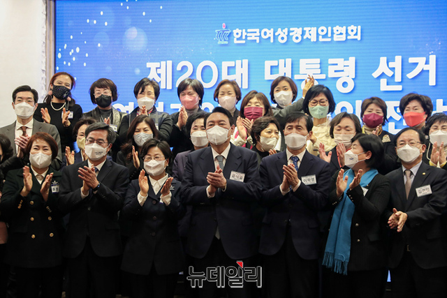 윤석열 국민의힘 대선후보가 14일 오후 서울 여의도 CCMM빌딩에서 열린 한국여성경제인협회 전국총회에 참석해 기념촬영을 하고 있다. (사진=윤석열 캠프)