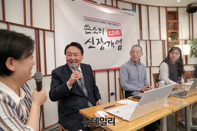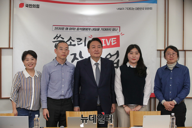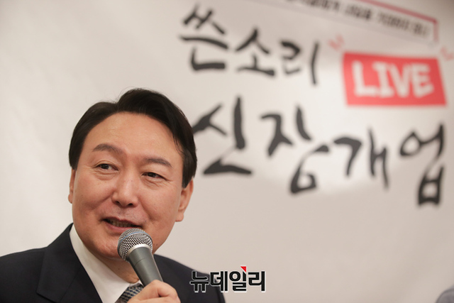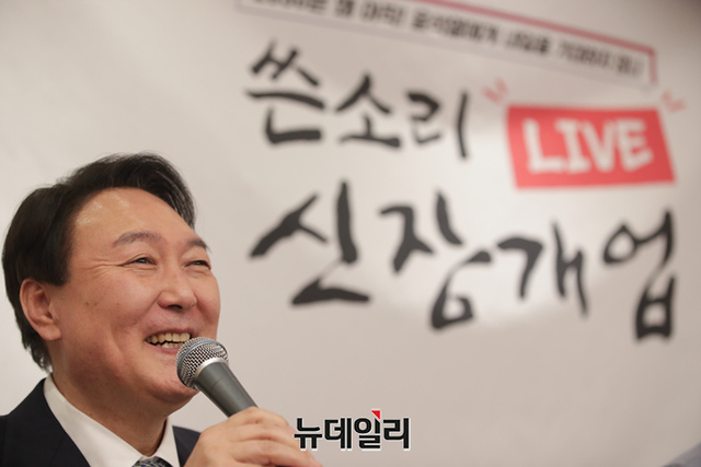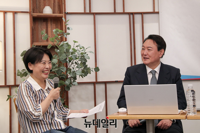 윤석열 국민의힘 대선후보가 14일 오후 국민의힘 선대위 '내일이 기대되는 대한민국 위원회' 윤희숙 위원장과 유튜브 방송을 하고 있다. (사진=윤석열 캠프)