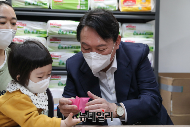 윤석열 국민의힘 대선 후보가 15일 오후 서울 성동구 가온한부모복지협의회에서 열린 약자와의 동행에서 관계자와 대화를 나누고 있다. (사진=윤석열 캠프)