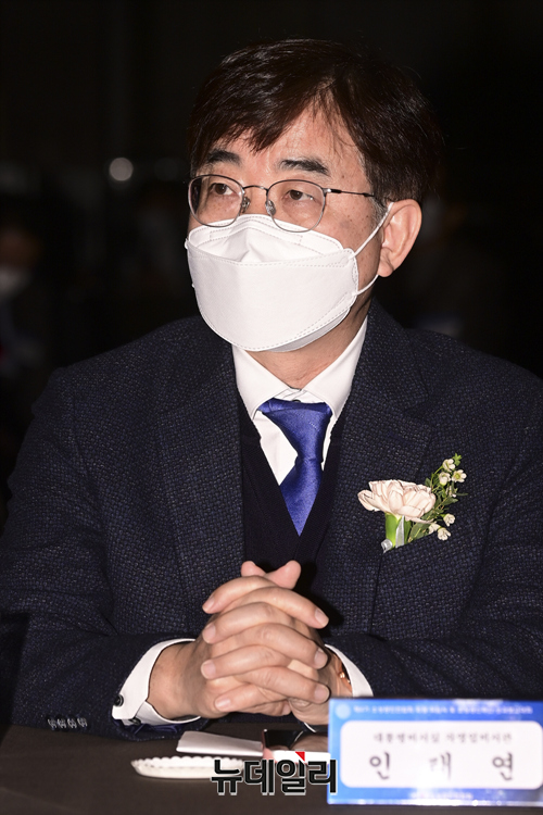 인태연 대통령비서실 자영업비서관이 15일 오후 서울 여의도 63빌딩 컨벤션센터 그랜드볼룸에서 열린 오세희 소상공인연합회장 취임식 및 소상공인주간 성과보고회에 참석해 있다.오 회장은 "코로나 피해 극복을 위한 온전한 소상공인 손실보상 등 입법대책 마련과 온라인 플랫폼 공정화법 제정, 근로기준법 5인 미만 사업자 확대 적용 반대 등 소상공인 현안 해결을 위해 주력 하겠다"고 말했다.행사에는 인태연 대통령비서실 자영업비서관, 윤호중 더불어민주당 원내대표, 이준석 국민의힘 대표, 여영국 정의당 대표, 오세희 소상공인연합회 회장, 유기준 소상공인연합회 수석부회장, 이동주 의원, 이성만 의원, 김교홍 의원, 김병욱 의원, 윤영석 의원, 최승재 의원, 류호정 의원, 김승수 의원, 허은아 의원 등이 참석했다.