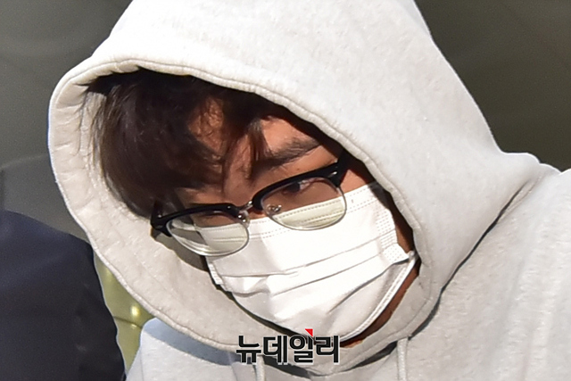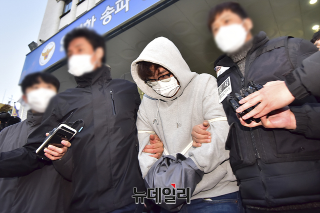 신변보호를 받는 전 여자친구의 가족을 살해한 혐의로 구속된 이석준이 17일 오전 서울 송파경찰서에서 나와 서울동부지방검찰청으로 송치되고 있다.