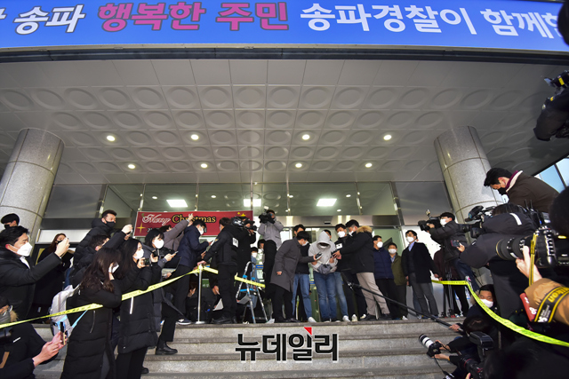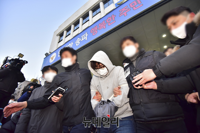 신변보호를 받는 전 여자친구의 가족을 살해한 혐의로 구속된 이석준이 17일 오전 서울 송파경찰서에서 나와 서울동부지방검찰청으로 송치되기 전에 취재진의 질문에 답하고 있다.