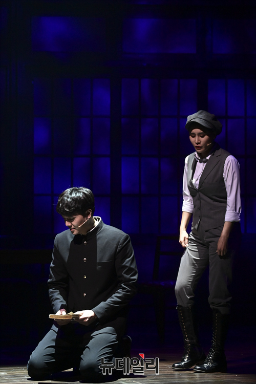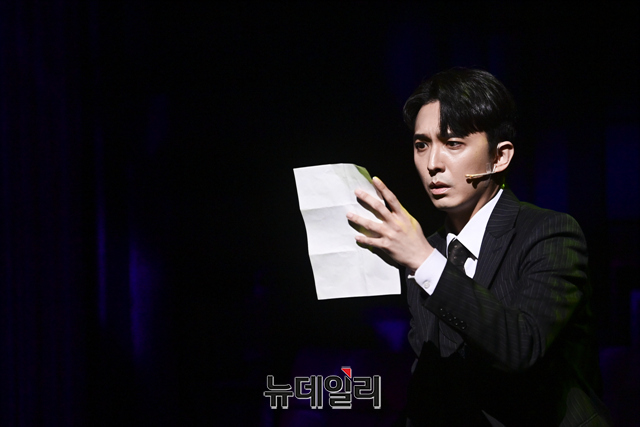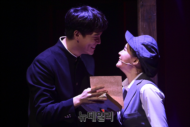 창작뮤지컬 '팬레터(총괄 강병원)' 프레스콜이 17일 오후 서울 강남구 코엑스아티움에서 열린 가운데 김해진 역을 맡은 배우 윤나무, 정세훈 역을 맡은 배우 김진욱, 히카루 역을 맡은 소정화, 김환태 역을 맡은 배우 김보현이 하이라이트 장면을 선보이고 있다.'팬레터'는 시인 이상과 김유정, 순수문학단체 구인회 등 실제 역사적 인물을 모티브로 1930년대 경성을 배경했다. 천재 소설가 '김해진'과 그를 동경하는 소설가 지망생 '정세훈', 그리고 비밀에 싸인 천재 여성 작가 '히카루'까지 세 인물 중심으로 사랑과 예술을 다룬 뮤지컬이다. 2022년 3월 20일까지 서울 코엑스아티움에서 열린다.