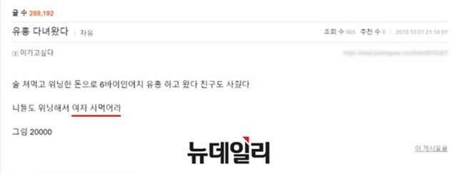 2019년 10월 도박사이트 게시판에 '도박해 딴 돈으로 친구와 성매수' 암시하는 글여성사진 게시물에는… "뭐하는 X이냐, 룸에서 일 잘하게 생겼네" 성비하 댓글도