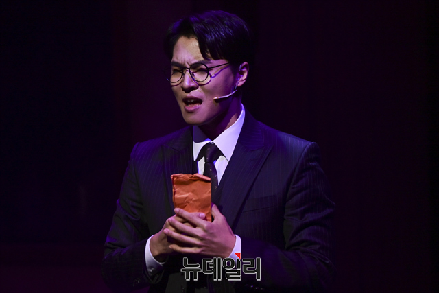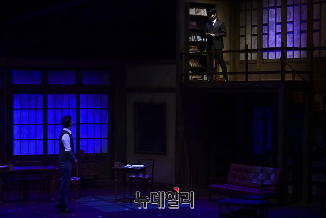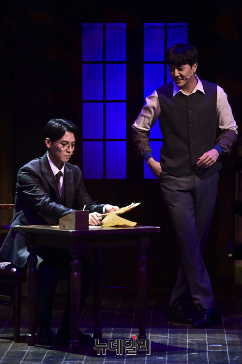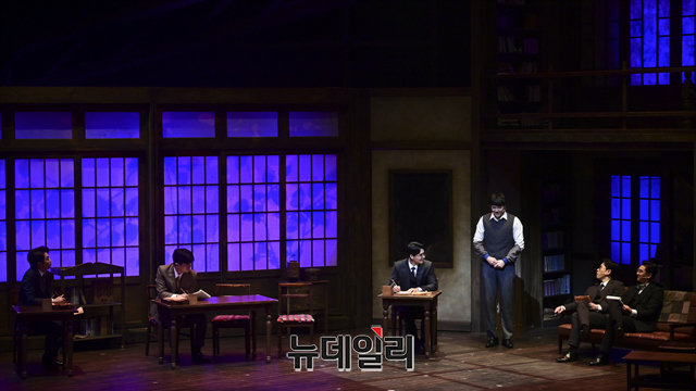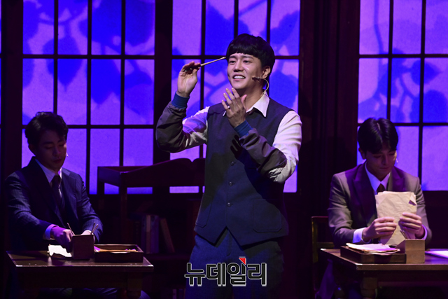 창작뮤지컬 '팬레터(총괄 강병원)' 프레스콜이 17일 오후 서울 강남구 코엑스아티움에서 열린 가운데 김해진 역을 맡은 백형훈, 정세훈 역을 맡은 김진욱, 히카루 역을 맡은 허혜진, 이윤 역을 맡은 이형훈, 이태준 역을 맡은 윤석현, 김수남 역을 맡은 김태인, 김환태 역을 맡은 김보현이 하이라이트 장면을 선보이고 있다.'팬레터'는 실제 역사적 인물을 모티브로 1930년대 경성을 배경으로 한 창작뮤지컬로 천재 소설가 '김해진'과 그를 동경하는 소설가 지망생 '정세훈', 그리고 비밀에 싸인 천재 여성 작가 '히카루'까지 세 인물 중심으로 사랑과 예술을 다룬 작품이다. 2022년 3월 20일까지 서울 코엑스아티움에서 열린다.