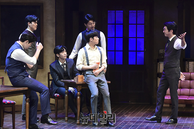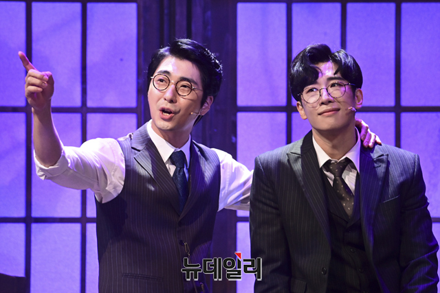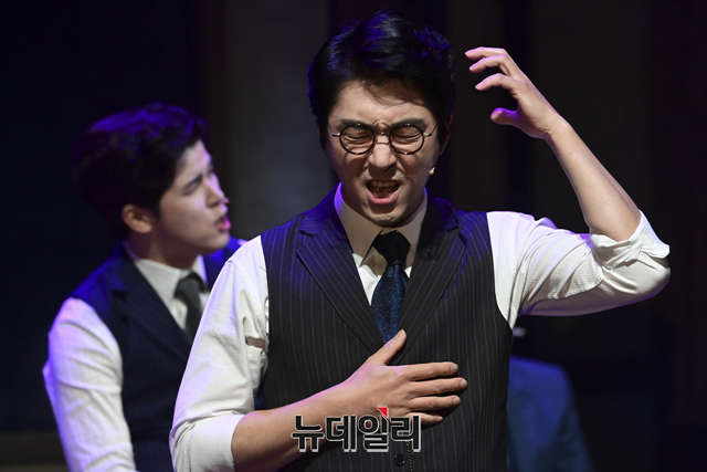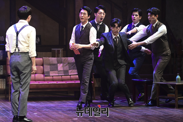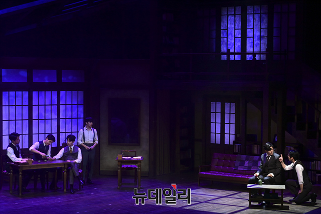 창작뮤지컬 '팬레터(총괄 강병원)' 프레스콜이 17일 오후 서울 강남구 코엑스아티움에서 열린 가운데 김해진 역을 맡은 김경수, 정세훈 역을 맡은 박준휘, 이윤 역을 맡은 박정표, 이태준 역을 맡은 임별, 김수남 역을 맡은 장민수, 김환태 역을 맡은 송상훈이 하이라이트 장면을 선보이고 있다.'팬레터'는 시인 이상과 김유정, 순수문학단체 구인회 등 실제 역사적 인물을 모티브로 1930년대 경성을 배경했다. 천재 소설가 '김해진'과 그를 동경하는 소설가 지망생 '정세훈', 그리고 비밀에 싸인 천재 여성 작가 '히카루'까지 세 인물 중심으로 사랑과 예술을 다룬 뮤지컬이다. 2022년 3월 20일까지 서울 코엑스아티움에서 열린다.