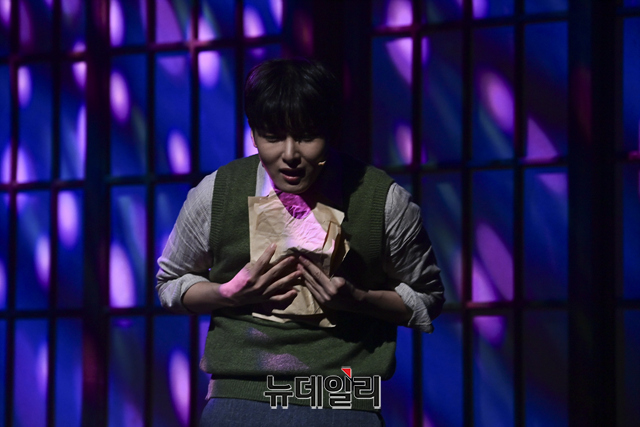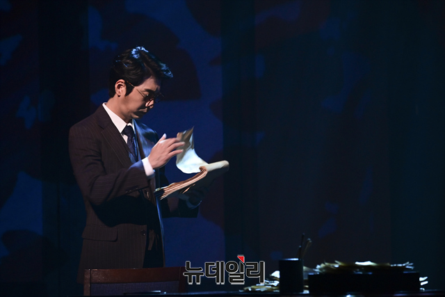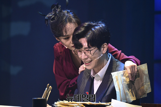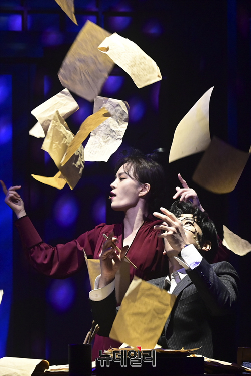 창작뮤지컬 '팬레터(총괄 강병원)' 프레스콜이 17일 오후 서울 강남구 코엑스아티움에서 열린 가운데 김해진 역을 맡은 김경수, 정세훈 역을 맡은 려욱, 히카루 역을 맡은 강혜인이 하이라이트 장면을 선보이고 있다.'팬레터'는 시인 이상과 김유정, 순수문학단체 구인회 등 실제 역사적 인물을 모티브로 1930년대 경성을 배경했다. 천재 소설가 '김해진'과 그를 동경하는 소설가 지망생 '정세훈', 그리고 비밀에 싸인 천재 여성 작가 '히카루'까지 세 인물 중심으로 사랑과 예술을 다룬 뮤지컬이다. 2022년 3월 20일까지 서울 코엑스아티움에서 열린다.