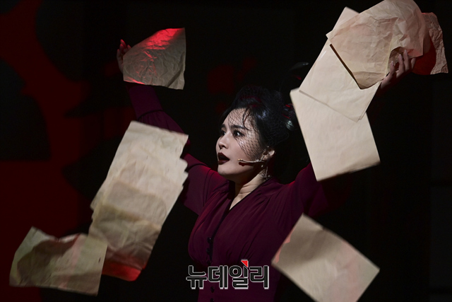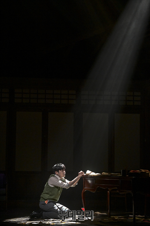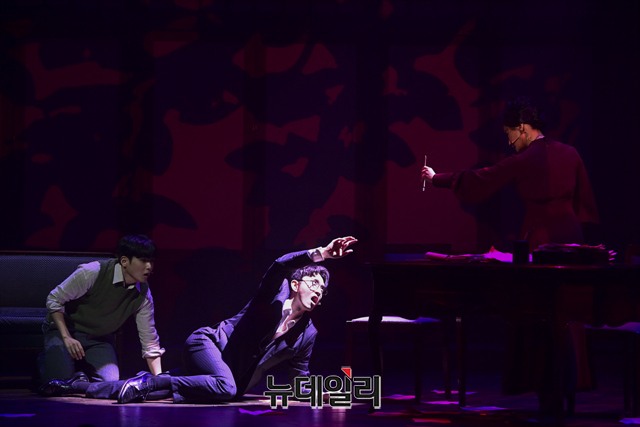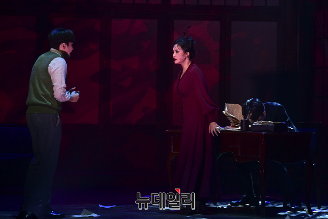 창작뮤지컬 '팬레터(총괄 강병원)' 프레스콜이 17일 오후 서울 강남구 코엑스아티움에서 열린 가운데 김해진 역을 맡은 윤나무, 정세훈 역을 맡은 려욱, 히카루 역을 맡은 소정화가 하이라이트 장면을 선보이고 있다.'팬레터'는 시인 이상과 김유정, 순수문학단체 구인회 등 실제 역사적 인물을 모티브로 1930년대 경성을 배경했다. 천재 소설가 '김해진'과 그를 동경하는 소설가 지망생 '정세훈', 그리고 비밀에 싸인 천재 여성 작가 '히카루'까지 세 인물 중심으로 사랑과 예술을 다룬 뮤지컬이다. 2022년 3월 20일까지 서울 코엑스아티움에서 열린다.