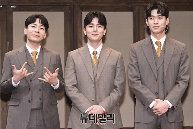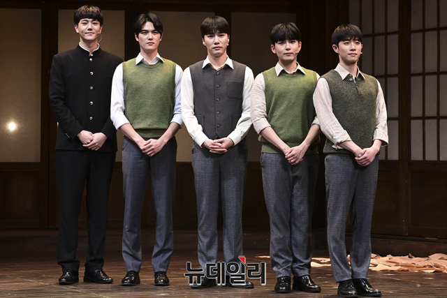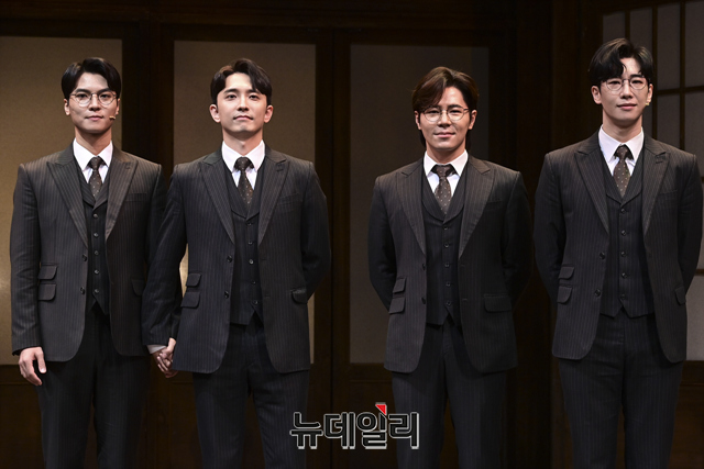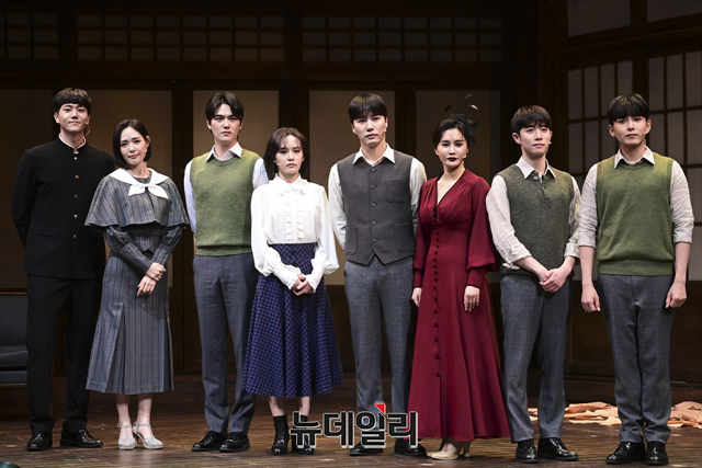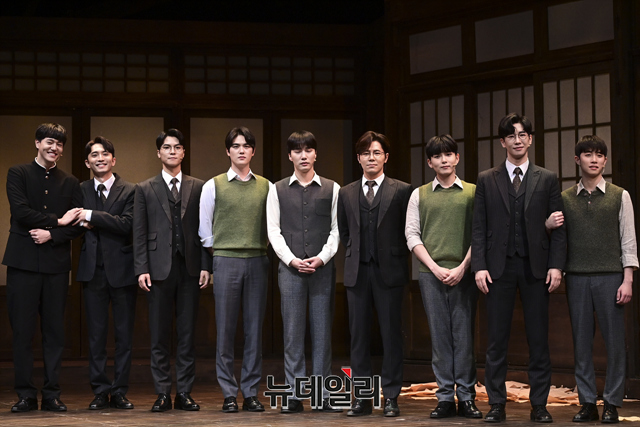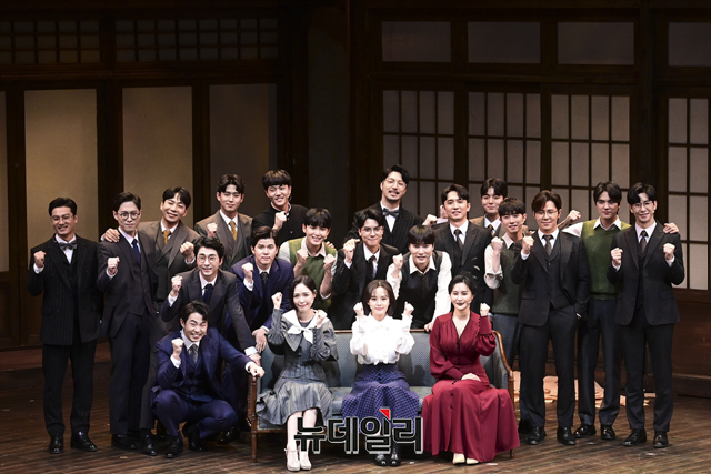 창작뮤지컬 '팬레터(총괄 강병원)' 프레스콜이 17일 오후 서울 강남구 코엑스아티움에서 열린 가운데 배우 김보현, 송상훈, 이승현, 장민수, 김태인, 윤석현, 임별, 박정표, 이형훈, 소정화, 강혜인, 허혜진 등이 기념 촬영을 하고 있다.'팬레터'는 시인 이상과 김유정, 순수문학단체 구인회 등 실제 역사적 인물을 모티브로 1930년대 경성을 배경했다. 천재 소설가 '김해진'과 그를 동경하는 소설가 지망생 '정세훈', 그리고 비밀에 싸인 천재 여성 작가 '히카루'까지 세 인물 중심으로 사랑과 예술을 다룬 뮤지컬이다. 2022년 3월 20일까지 서울 코엑스아티움에서 열린다.