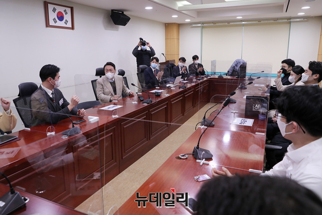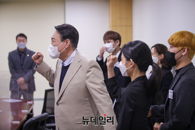 윤석열 국민의힘 대선후보가 18일 오전 서울 여의도 국회의원회과에서 열린 국민의힘 청년보좌역 공개 모집에 격려차 방문해 기념촬영을 하고 있다. (사진=윤석열 캠프)