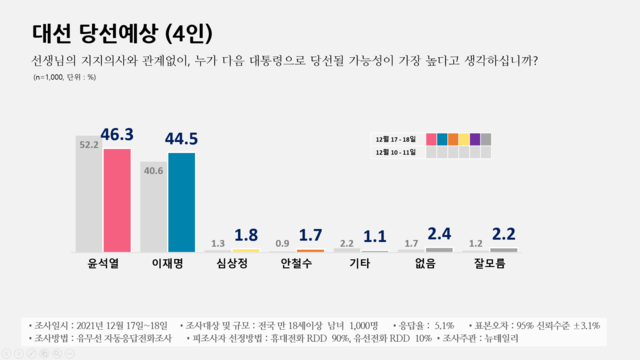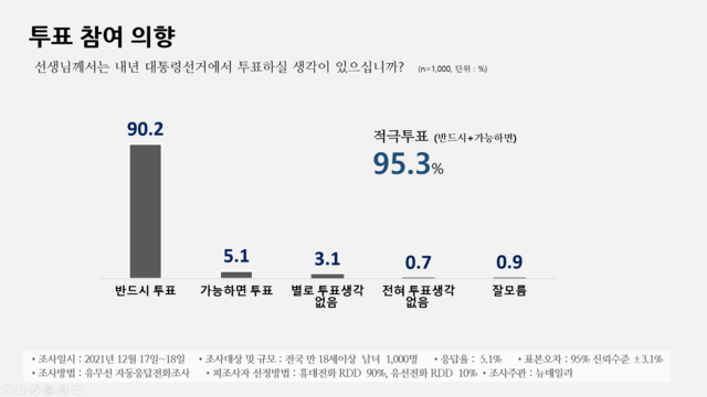 연령별로는 문재인정부 핵심 지지층인 40대, 그리고 50대를 제외한 전 계층에서 윤 후보가 높았다. △만 18세~20대 윤석열 38.7%, 이재명 32.4% △30대 윤석열 45.5%, 이재명 39.3% △40대 윤석열 29.9%, 이재명 59.2% △50대 윤석열 43.4%, 이재명 46.3% △60대 윤석열 61.3%, 이재명 26.0% △70대 이상 윤석열 50.1%, 이재명 38.8% 등으로 조사됐다.윤 후보는 지난 조사 대비 만 18세~20대(10.6%p), 30대(7.6%p), 40대(9.8%p), 50대(0.1%p), 60대(6.5%p), 70대 이상(16.3%p) 등 모든 계층에서 지지율이 떨어졌다.이 후보는 만 18세~20대(6.5%p)와 50대(7.9%p), 60대(1.4%p)에서 하락했다. 반면 30대(2.7%p)와 40대(2.6%p), 70대 이상(18.1%p) 등에서는 올랐다.'당선 예상' 윤석열 46.3%, 이재명 44.5%당선 예상과 관련, 윤 후보는 46.3%, 이 후보 44.5%로 각각 조사됐다. 윤 후보는 전주 대비 5.9%p 떨어졌고, 이 후보는 같은 기간 3.9% 올랐다. 심 후보는 1.8%(0.5p%↑), 안 후보 1.7%(0.8p%↑)였다. '지지하는 후보 없음'은 2.4%(0.7%p↑), '기타' 1.1%(1.1%p↓), '잘 모름' 2.2%(1.0%p↑)였다.내년 대선에 투표할 의향이 있는지를 묻는 질문에는 '반드시 투표하겠다' 90.2%, '가능하면 투표하겠다' 5.1%인 것으로 집계됐다. 두 답변을 합한 '적극 투표층'은 95.3%였다. '별로 투표할 생각이 없음'은 3.1%, '전혀 투표 생각이 없음' 0.7%, '잘 모름' 0.9%였다.이번 조사는 유무선 자동응답 전화조사 방식으로 진행됐다. 휴대전화 RDD 90%, 유선전화 RDD 10% 비율로 피조사자를 선정했으며, 최종 응답률은 5.1%, 표본오차는 95% 신뢰수준에서 ±3.1%p다.조사완료 후 2021년 10월 행정안전부 주민등록인구를 기준으로 지역별, 성별, 연령별 가중값을 부여(림가중)했으며, 자세한 조사 개요와 결과는 중앙선거여론조사심의위원회 홈페이지를 참고하면 된다.