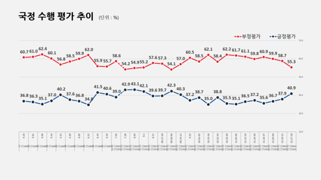 文 국정수행 지지율 지난주 37.9%→이번주 40.9%로 상승… 부정평가는 58.7%→55.3%경기·인천 제외한 전 권역에서 지난주보다 '긍정평가' 올라… 강원·제주서 50.8% '잘한다'다만, 40대 제외한 전 연령층서 부정평가가 50% 넘어… 60대 긍정평가는 28.3%