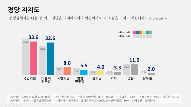 국민의힘와 더불어민주당 지지율이 일주일 만에 다시 오차범위 내로 좁혀졌다. 지난주 조사에선 국민의힘이 지지율 36.0%를 보여, 더불어민주당 지지율 29.1%를 오차범위 밖에서 앞섰지만, 이번 조사에선 1.0%p 차로 다시 줄었다.뉴데일리 의뢰로 여론조사업체 ㈜피플네트웍스리서치(PNR)가 지난 17~18일 전국 만18세 이상 남녀 1000명을 대상으로 정당 지지도를 조사한 결과, 국민의힘은 33.6%, 민주당은 32.6%로 집계됐다.국민의힘 지지율 지난 조사 때 36.0%보다 2.4%p 하락국민의힘 지지율은 지난주 조사 때 36.0%보다 2.4%p 내렸다. 민주당은 지난주 29.1%보다 3.5%p 올랐다. 이에 따라 6.9%p까지 벌어졌던 일주일 만에 양당 지지율은 다시 오차범위 내인 1.0%p 차이로 줄었다.국민의당은 0.7%p 하락한 8.0%, 열린민주당은 5.5%(1.7%p 하락), 정의당은 4.0%(0.1%p 상승)를 얻었다. '기타정당'은 3.3%, '없음'은 11.0%, '잘 모름'은 2.0%였다.지역별로 살펴보면, 국민의힘은 서울 지역에서 41.0% 지지율을 얻어, 민주당 27.4%를 13.6%p 차이로 비교적 크게 앞섰다. 다만 지난주 조사에서 서울 지역 국민의힘 지지율이 47.0%, 민주당은 18.6%였던 것(28.4%p)에 비해 격차가 줄었다. 경기·인천은 민주당이 33.6%로 국민의힘 32.3%보다 오차 범위 내에서 높았다.강원·제주 지역 판세 출렁… 국민의힘 42.3%→30.5%로 추락특히 강원·제주에서 민주당과 국민의힘 지지율이 각각 41.8%, 30.5%로 조사됐는데, 이 권역의 경우 지난주 조사에선 민주당이 25.6%, 국민의힘이 42.3%였다. 일주일 만에 지지율 판도가 크게 바뀐 것이다.이어 대전·세종·충남북에선 민주당 지지율이 35.5%로 국민의힘 29.1%보다 높게 나왔다. 광주·전남북에선 민주당 54.0%, 국민의힘 19.0%였다. 대구·경북은 민주당 29.3%, 국민의힘 34.6%, 부산·울산·경남은 민주당 20.3%, 국민의힘 40.2%였다.성별로 보면 남성에서 국민의힘 지지율은 35.0%, 민주당 지지율은 32.1%였다. 여성에서는 민주당 지지율이 33.1%, 국민의힘 지지율이 32.3%였다.2030에서도 양당 지지율 오차범위 내 접전연령대별로 보면, 먼저 만18세~만20대에선 국민의힘 30.2%, 민주당 28.9% 지지율로 국민의힘이 오차 범위 내에서 앞섰다. 30대에서도 국민의힘 35.5%, 민주당 31.5%로 오차 범위 내였다. 40대에선 민주당이 42.4%, 국민의힘 21.3%로 21.1%p 격차로 민주당이 앞섰다.50대는 민주당 36.2%, 국민의힘 31.0%로 오차 범위 내에서 민주당이 높았다. 60대는 국민의힘 50.0%, 민주당 21.2%로 격차(28.8%p)가 컸지만, 70세 이상은 국민의힘이 36.9%, 민주당 33.5%로 오차범위 내였다.투표참여의향을 보면, 내년 대선에서 ‘반드시 투표하겠다’는 응답자 중 34.1%가 민주당을 지지했고, 35.3%가 국민의힘을 지지했다. ‘가능하면 투표하겠다’는 응답자 중에선 21.3%가 민주당을, 28.4%가 국민의힘을 지지했다. 이어 ‘별로 투표생각 없음’이라고 답한 응답자 중 15.4%가 민주당을, 3.6%가 국민의힘을 지지했고, ‘전혀 투표생각 없음’이란 응답자 중에선 12.9%가 민주당을, 12.8%가 국민의힘을 지지했다.이번 조사는 뉴데일리 의뢰로 PNR 리서치가 12월 17~18일 이틀 동안 전국 만18세 이상 남녀 1000명을 대상으로 유무선 자동응답 전화조사 방식으로 진행됐다. 휴대전화 RDD 90%, 유선전화 RDD 10% 비율로 피조사자를 선정했으며 최종 응답률은 5.1%, 표본오차는 95% 신뢰수준에서 ±3.1%p다. 조사완료 후 2021년 10월 행정안전부 주민등록인구를 기준으로 지역별, 성별, 연령별 가중값을 부여(림가중)했다. 자세한 내용은 중앙선거여론조사심의위원회 홈페이지를 참고하면 된다.