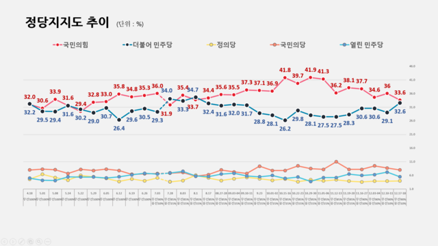 국민의힘 지난주 36.0%→이번주 33.6%로 하락... 민주당 29.1%→32.6% 상승서울지역 국민의힘 지지율 지난주 47.0%→41.0%로… 강원·제주 지역 지지율 판도 출렁