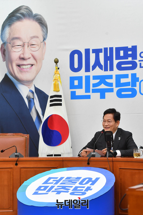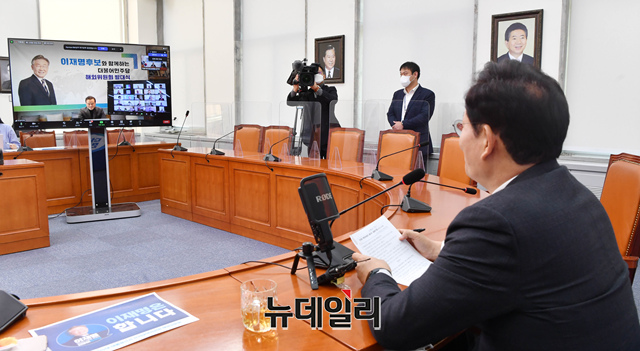 송영길 더불어민주당 대표가 20일 오전 국회에서 온라인으로 열린 선대위 해외위원회 발대식 인사말을 하고 있다. (사진=공동취재단)