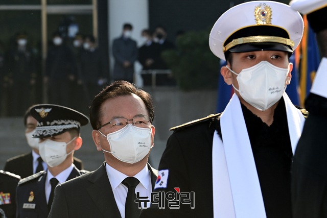 김부겸 국무총리가 20일 오전 서울 동작구 국립서울현충원에서 거행된 6·25 전사자 발굴유해 합동 봉안식에서 영현 봉송 대열에 경례를 하고 있다.