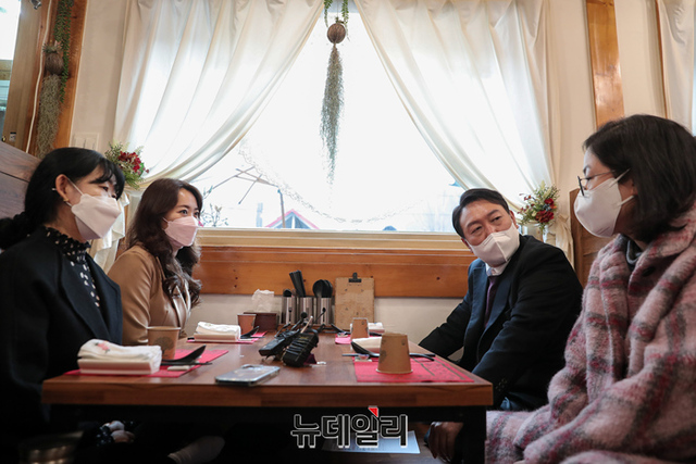 윤석열 국민의힘 대선후보가 20일 오후 강원 철원군 동송읍에서 육군 3사단 소속 군인 가족들과 오찬을 갖고 있다. (사진=윤석열 캠프)