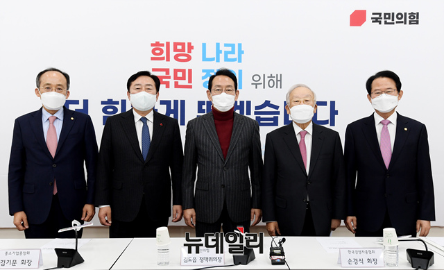 김기문 중소기업중앙회장과 손경식 한국경영자총협회장이 20일 오후 국회에서 김도읍 국민의힘 정책위의장과 면담을 하기 전 기념촬영을 하고 있다. (사진=공동취재단)
