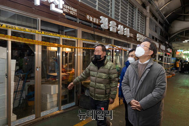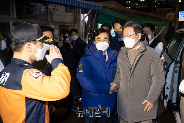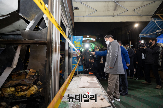 [포토] 청량리 청과물시장 화재현장 찾은 이재명 후보