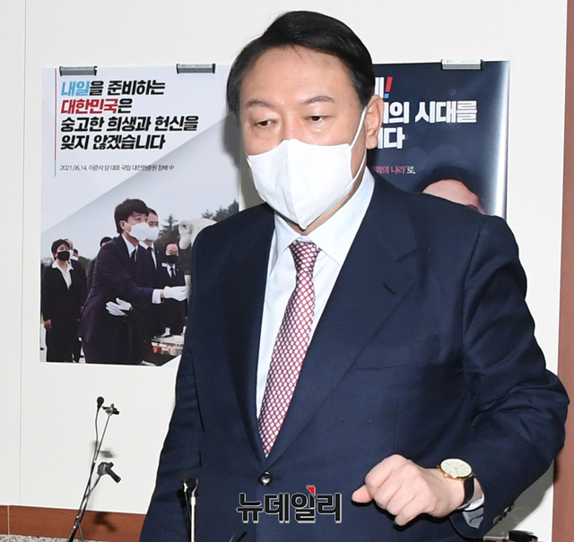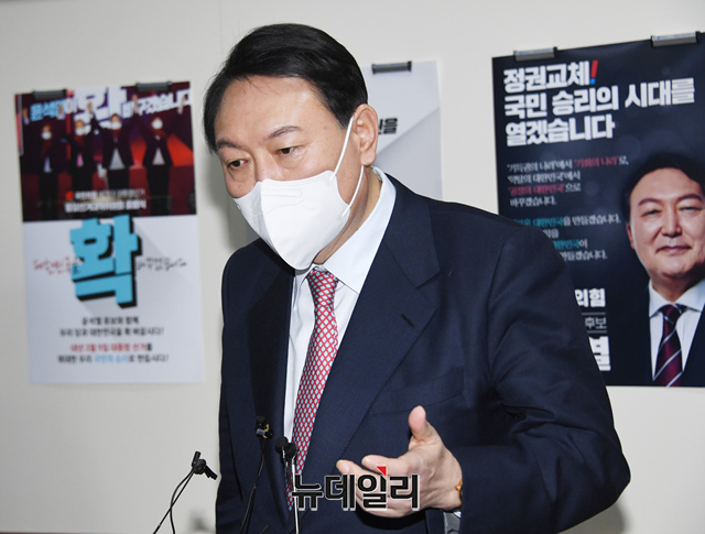 윤석열 국민의힘 대선후보가 21일 국회에서 열린 코로나19 극복을 위한 비상대책회의를 마치고 나오며 이준석대표와 조수진 공보단장의 갈등등에 대한 질문을 받고 있다. (사진=공동취재단)