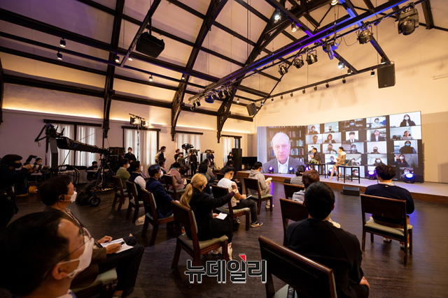 이재명 더불어민주당 대선후보가 21일 서울 중구 정동1928 아트센터 이벤트홀에서 마이클 샌델 하버드 교수와 '대전환의 시대, 대한민국은 어떻게 공정의 날개로 비상할 것인가'의 주제로 화상 대담을 하고 있다.