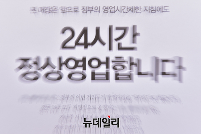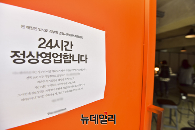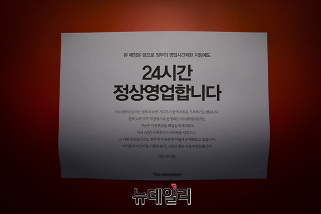 정부의 코로나19 바이러스 방역 강화 조치를 거부하는 내용의 안내문이 21일 오후 경기 용인시의 한 카페 출입문에 부착 돼 있다.안내문은 "본 매장은 앞으로 정부의 영업 시간제한 지침에도 24시간 정상 영업 합니다" 문구가 적혀있다. 또 "지난 1년간 누적적자가 10억을 넘었다"며 "어떤 손실보상금도 전혀 받지 못한채 카페를 운영을 해오고 있다"고 입장을 밝혔다.정부의 고강도 사회적 거리두기로 생존권을 위협 받는 자영업자들은 22일 오후부터 광화문에서 방역대책에 반대하는 총궐기를 예고 했다. (경기 용인=강민석 기자)