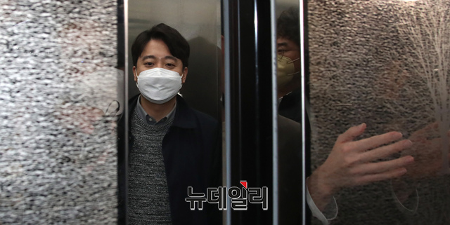 이준석 국민의힘 대표겸 상임선대위원장이 22일 오후 국회에서 상임선대위원장직 사퇴를 밝히고 회견장을 떠나고 있다.