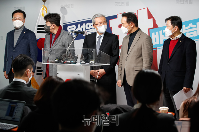 김종인 국민의힘 총괄선대위원장이 22일 오후 서울 여의도 국민의힘 당사에서 대장동 사건 특검 촉구 긴급 기자회견을 하고 있다. (사진=공동취재단)