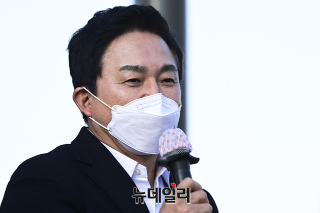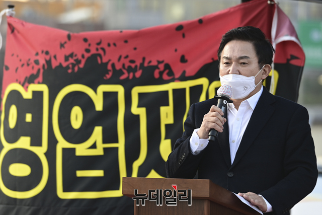 원희룡 국민의힘 선거대책위원회 총괄본부장이 22일 오후 서울 종로구 광화문에서 열린 자영업자 총궐기 대회에 참석해 발언하고 있다.
