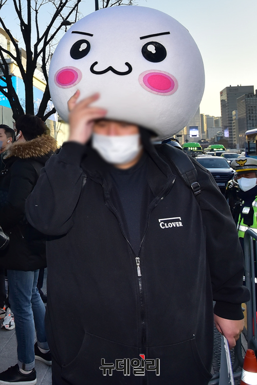 [포토] 일베 캐릭터 '베충이' 탈 쓰고 자영업자 총궐기대회 등장한 참가자