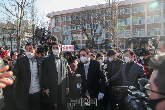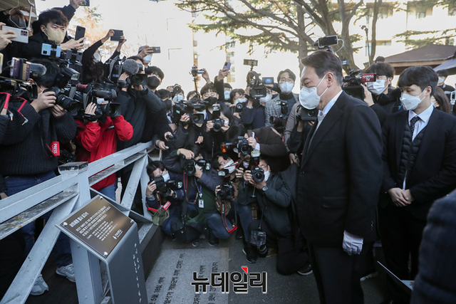 호남지역을 방문중인 윤석열 국민의힘 대선후보가 22일 오후 전북대에서 이세종 열사를 추모하고 대학생들을 만나 발언하고 있다. (사진=윤석열 캠프)