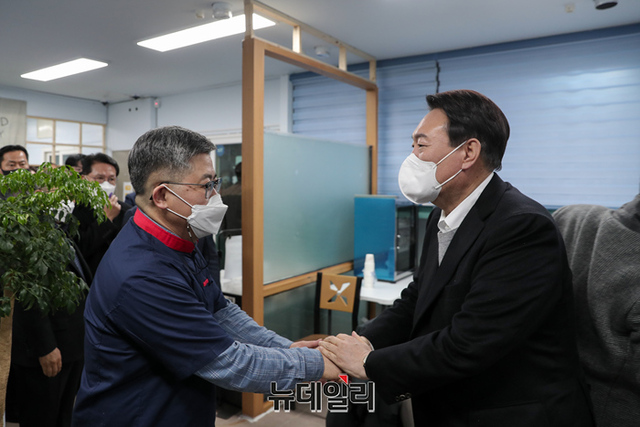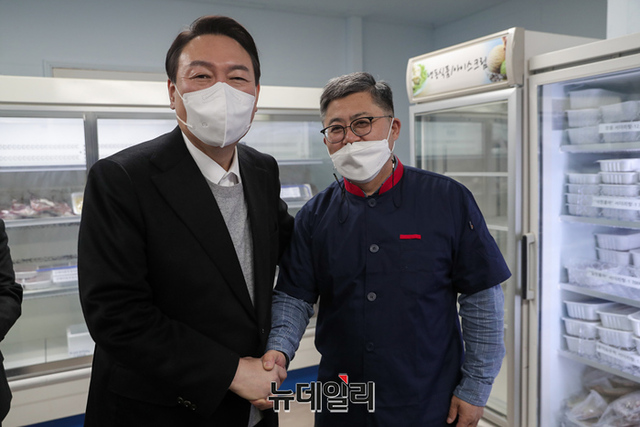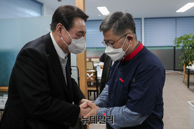 호남지역을 방문중인 윤석열 국민의힘 대선후보가 22일 오후 전북 군산시에서 횟집을 운영중인 함운경 씨를 만나 대화를 나누고 있다. (사진=윤석열 캠프)