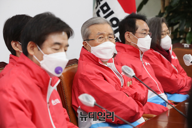 김종인 국민의힘 총괄선대위원장이 23일 오전 국회에서 열린 중앙선거대책위원회의에서 눈을 감고 있다. (사진=공동취재단)