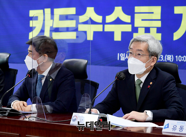 고승범 금융위원장이 23일 오전 국회에서 열린 '카드수수료 개편방안 당정협의'에서 모두발언을 하고 있다. (사진=공동취재단)