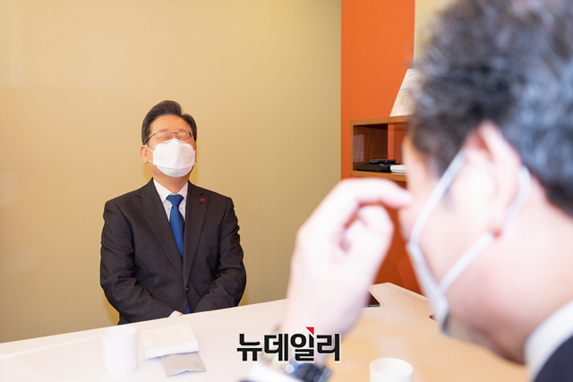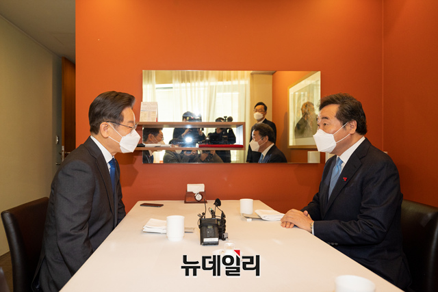 이재명 더불어민주당 대선후보와 이낙연 전 총리가 23일 중구 달개비 식당에서 열린 오찬 회동에서 대화를 나누고 있다. (사진=이재명 캠프)