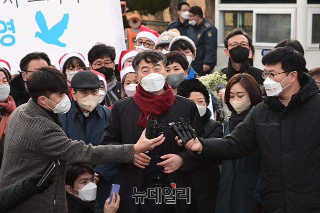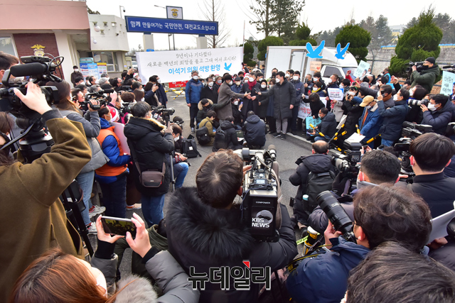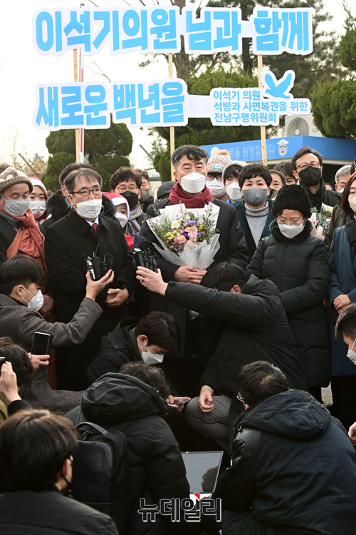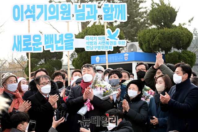 '내란 선동죄 등' 혐의로 징역 9년을 선고 받은 이석기 전 통합진보당 의원이 24일 오전 대전 유성구 대전구치소에서 가석방 출소 한 후 "박근혜 전 대통령의 사면에 통탄스럽다"고 말했다.