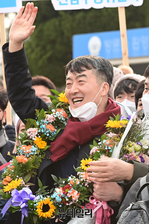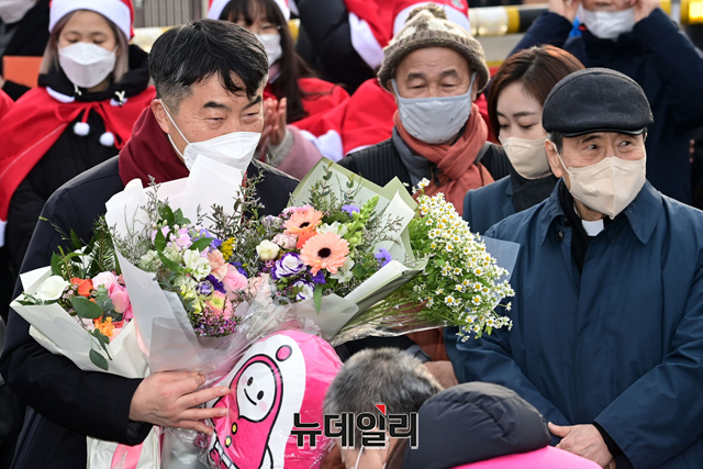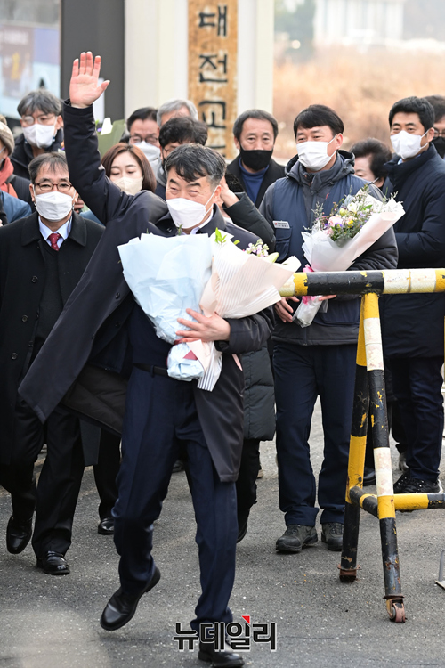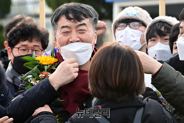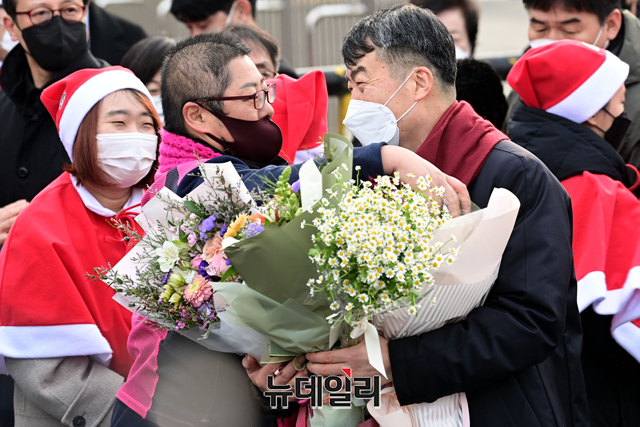 '내란 선동죄 등' 혐의로 징역 9년을 선고 받은 이석기 전 통합진보당 의원이 24일 오전 대전구치소 앞에서 가석방 출소 후 지지자들에게 꽃다발을 받고 있다.